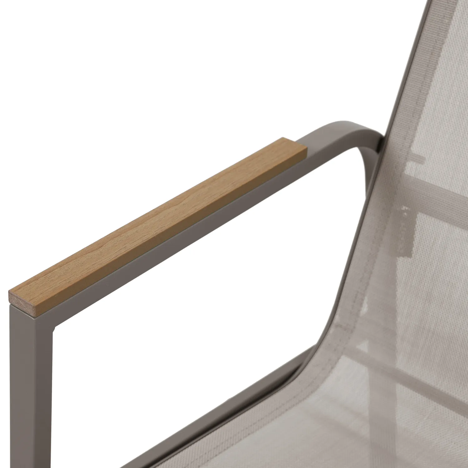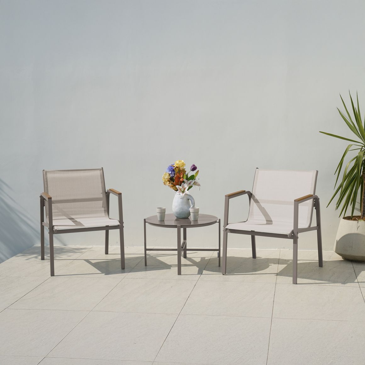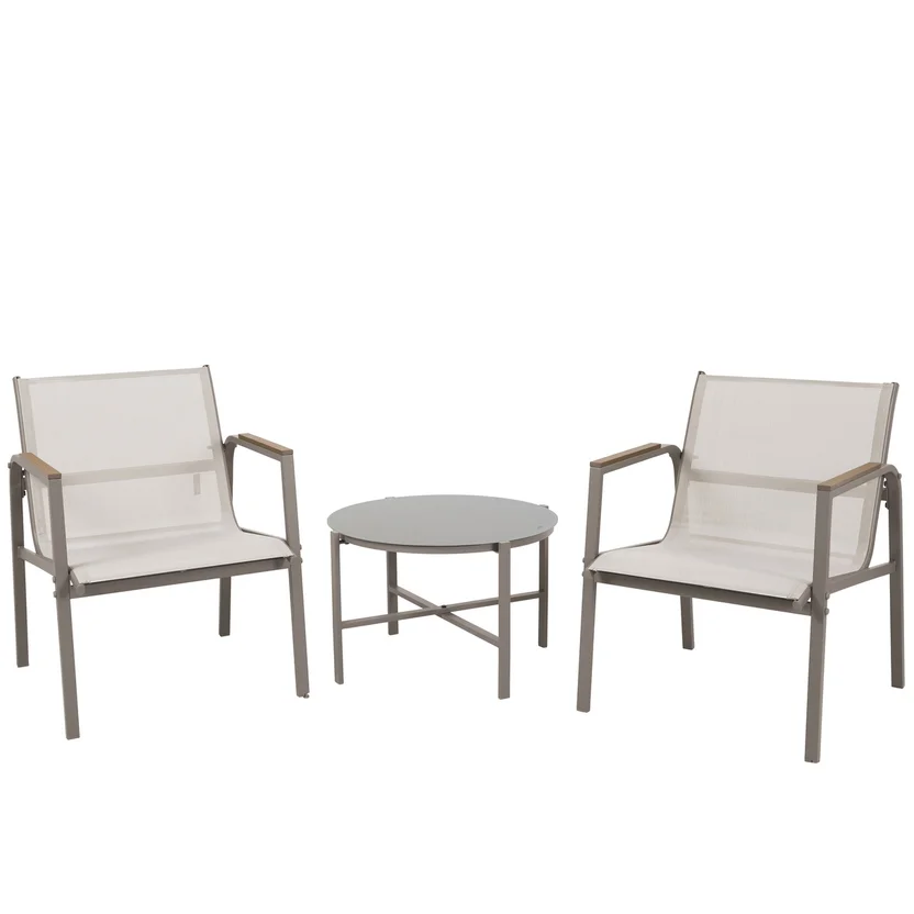 Este conjunto de varanda é composto por 1 mesa e 2 cadeiras, com assento do tipo cadeira de acampamento. As cadeiras possuem apoio de braço para maior conforto. A mesa tem dimensões de 65x41 cm, enquanto as cadeiras medem 62x45x81 cm. O material principal é madeira ecológica, com acabamento na cor Taupe. O conjunto é importado e requer montagem.