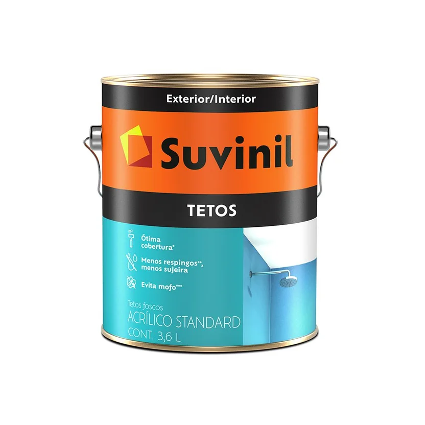 Deixe seus tetos impecáveis com a Tinta Acrílico Teto Suvinil Acrílico Fosco Tetos! Ideal para tetos, ela oferece alta cobertura, secagem rápida e fácil aplicação, além de proteger contra a proliferação de fungos. Com a Tinta Acrílico Teto Suvinil Acrílico Fosco Tetos, você terá um acabamento impecável e um ambiente mais bonito e saudável.