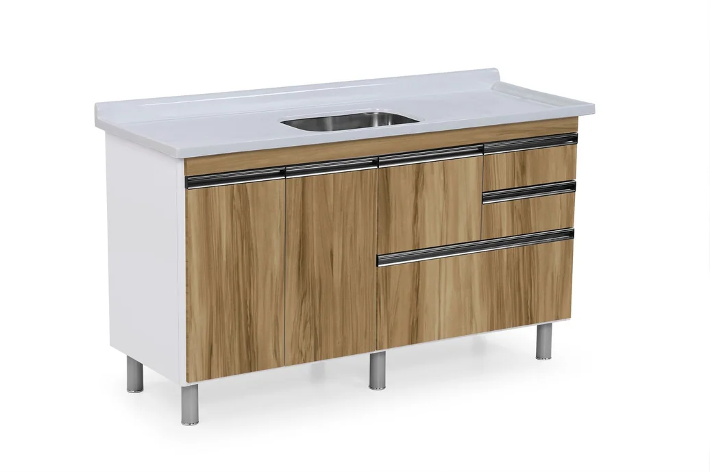 Pés com regulagem de altura, puxadores em ABS metalizado.